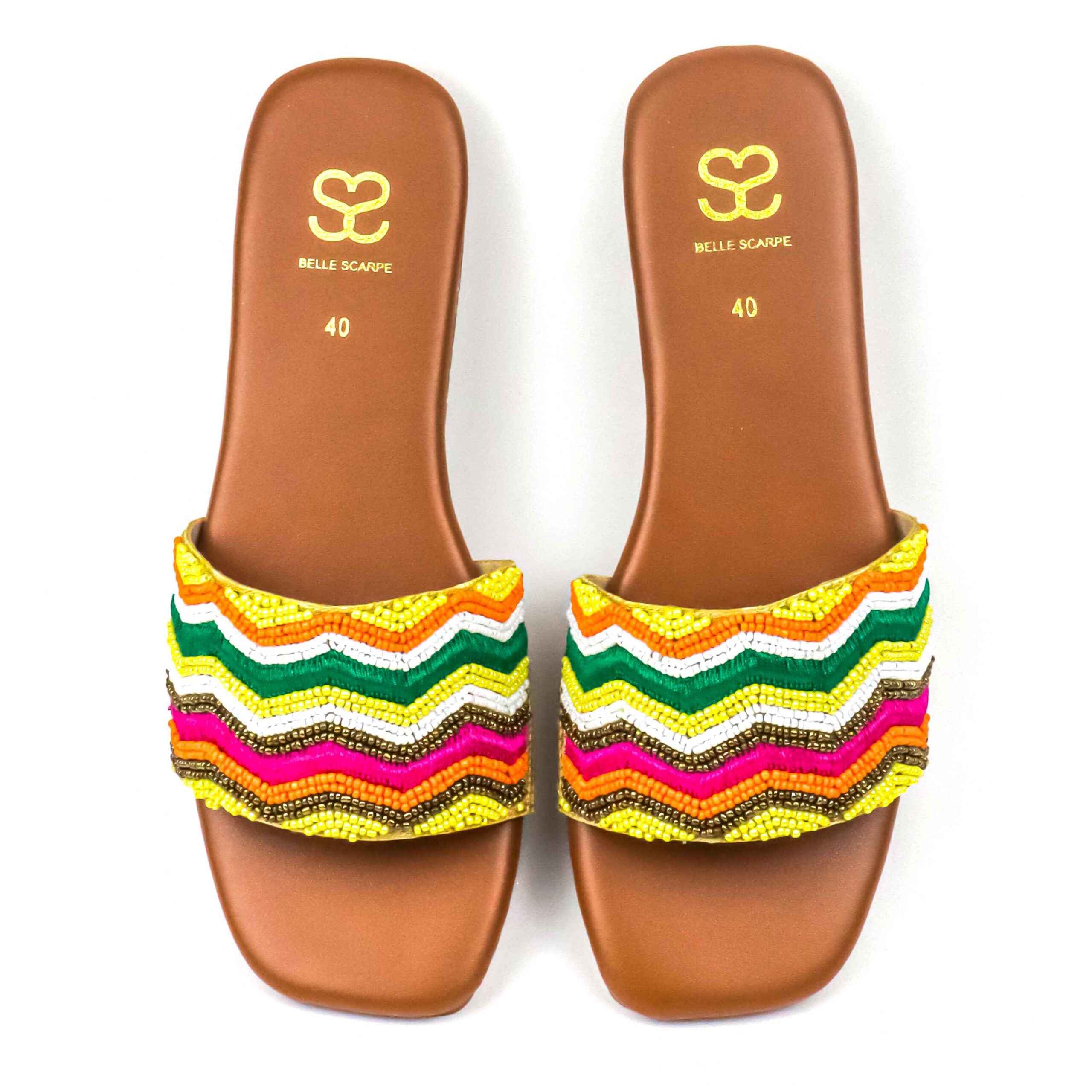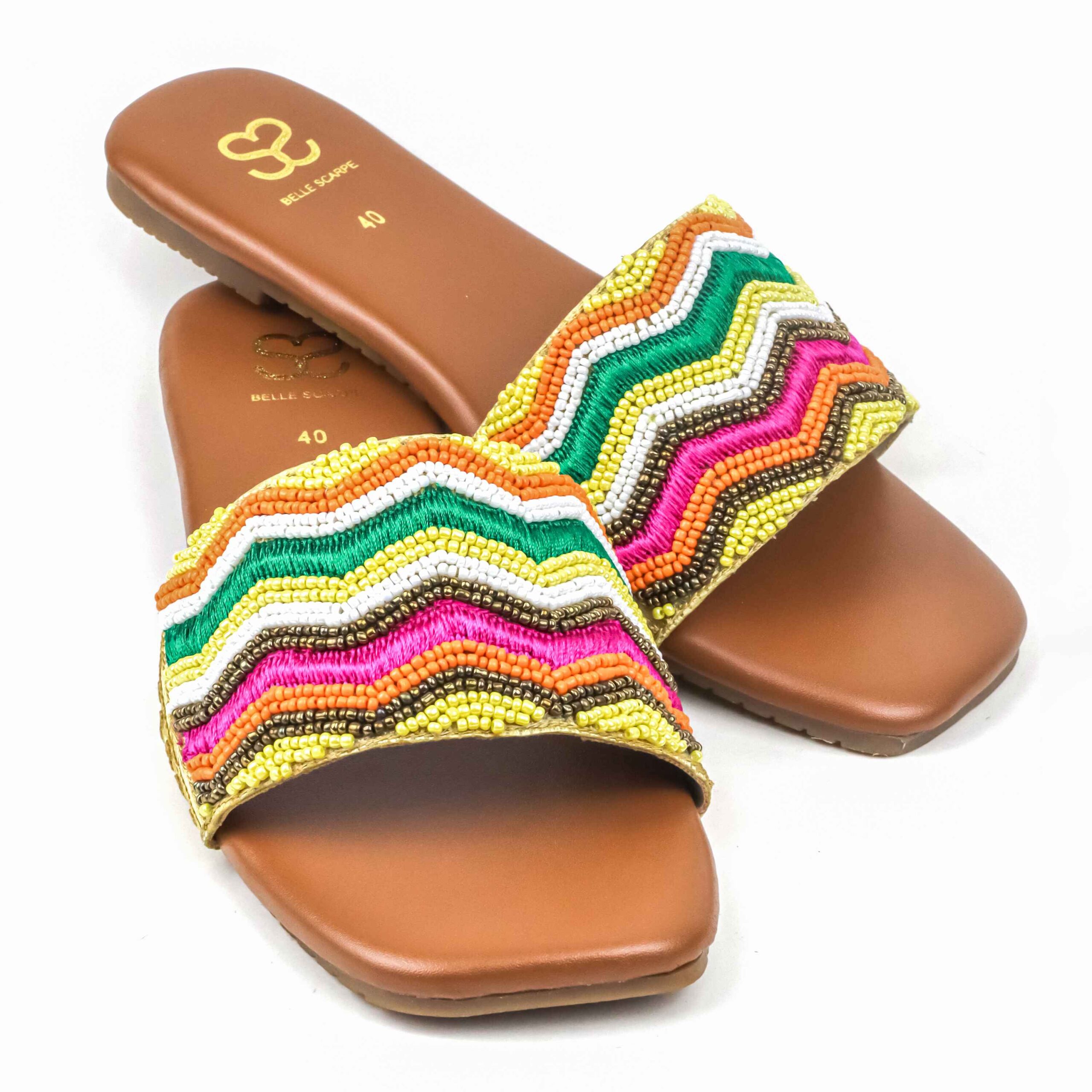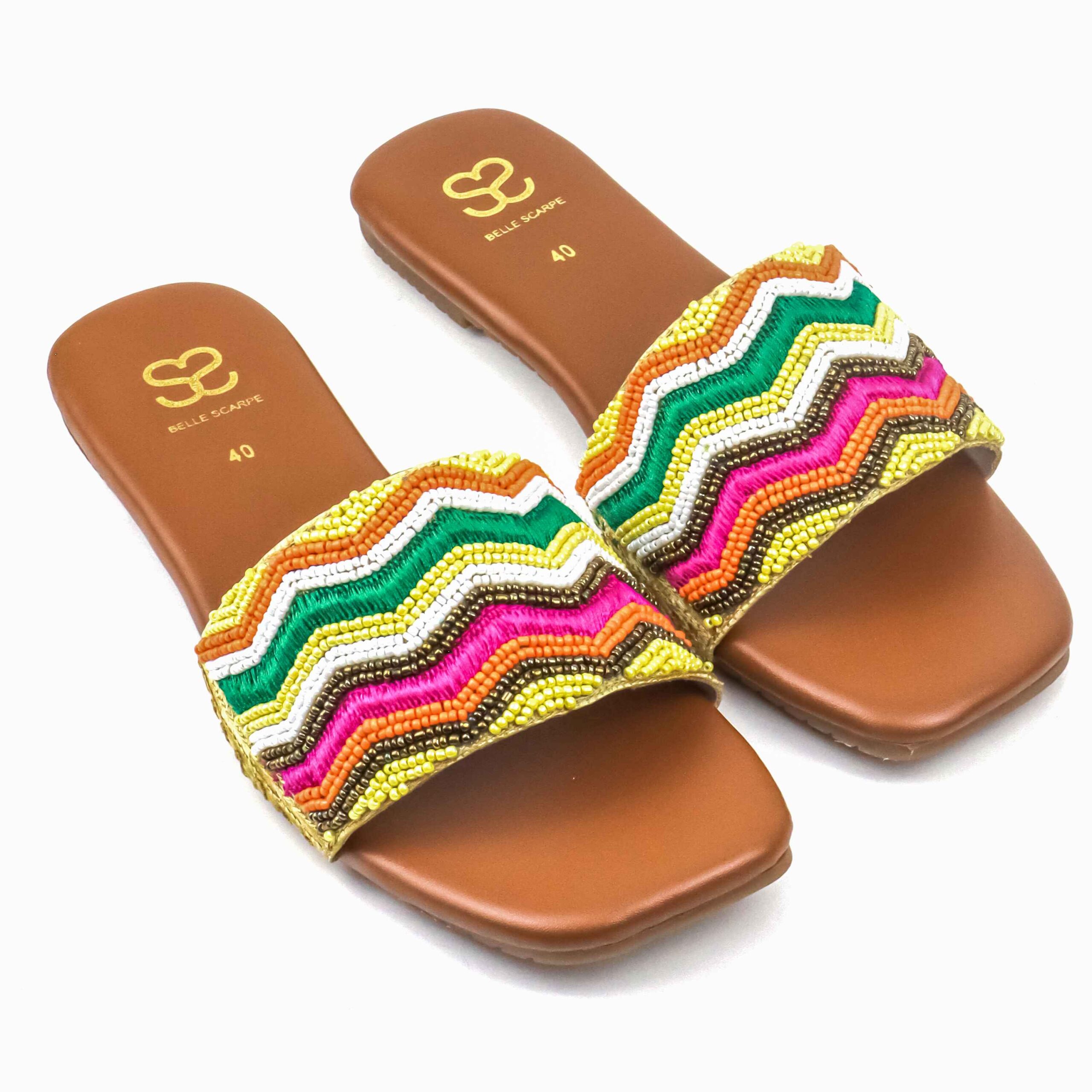 Cocktail: A symphony of chromaticity and texture. Hand embroidery and beads work dance across fine leather, evoking the vibrant hues and playful spirit of a refreshing cocktail. The multicolored zig-zag lining adds a touch of elegance, making this slider a true masterpiece.