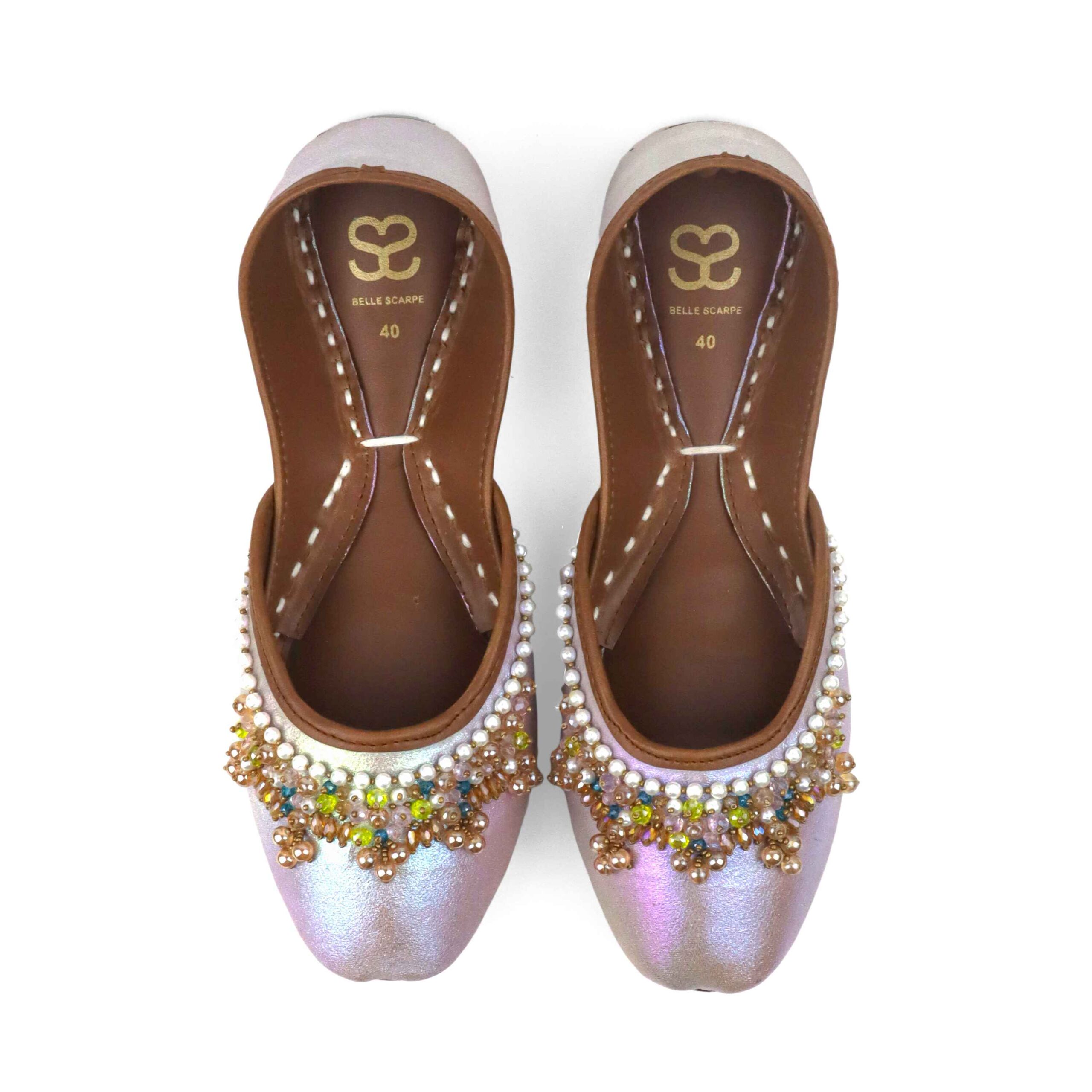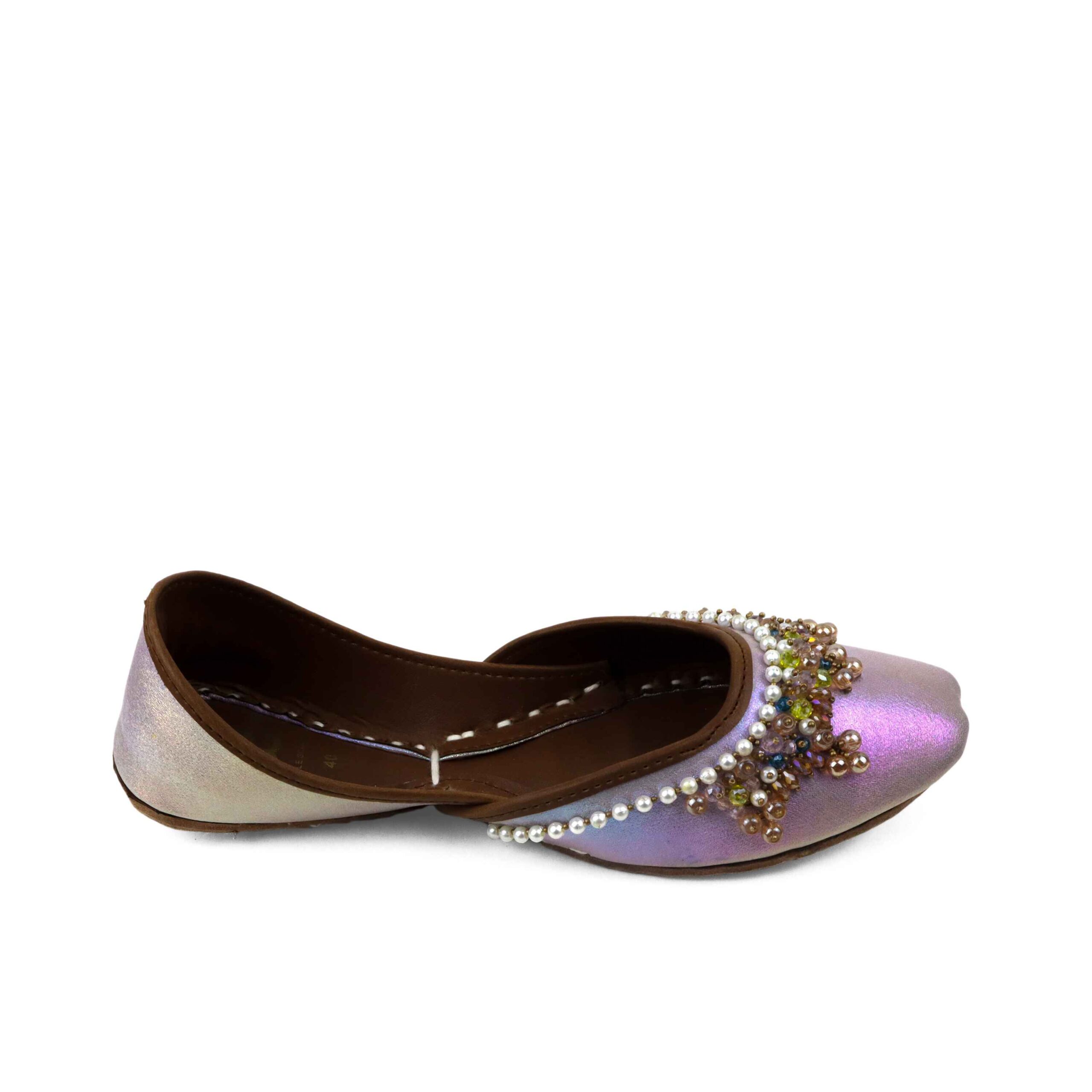 “Behold the ‘Holo Mauvy’ Khussa, a paradigmatic masterpiece of artisanal craftsmanship and avant-garde design that transcends the boundaries of conventional footwear. This exquisite shoe is fashioned from the finest premium leather and embellished with intricate hand embroidery that exemplifies the artisan’s virtuosity and dedication, iridescent fabric that radiates a mesmerizing luminescence, and holographic shades that exhibit a dazzling chromatic versatility.”